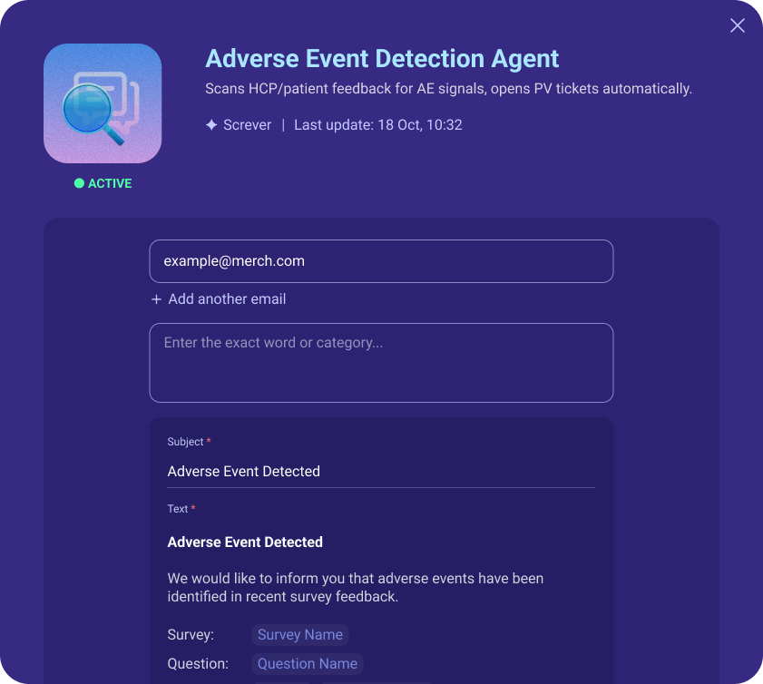 Pharmacovigilance automation built for modern life sciences. Screver AI continuously scans feedback, forms, and digital touchpoints for potential adverse events – alerting your PV teams instantly, with full traceability and audit-ready logs.