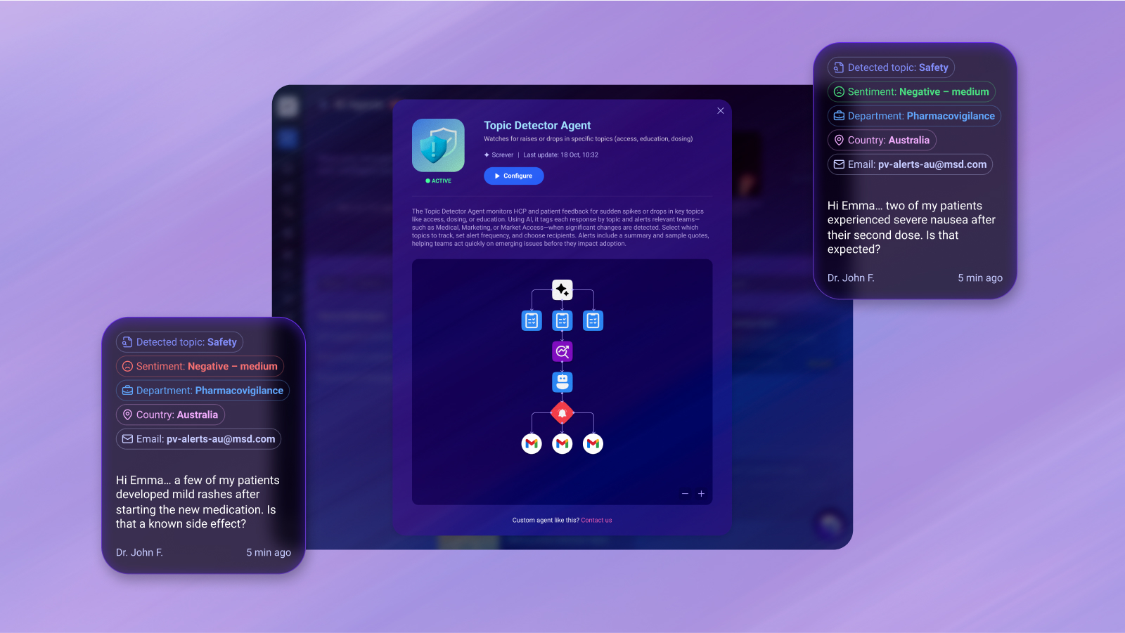 It continuously listens for spontaneous mentions of side effects or safety concerns, turning raw text into structured, compliant data streams ready for pharmacovigilance review.